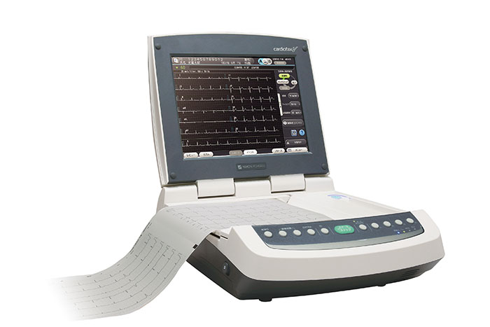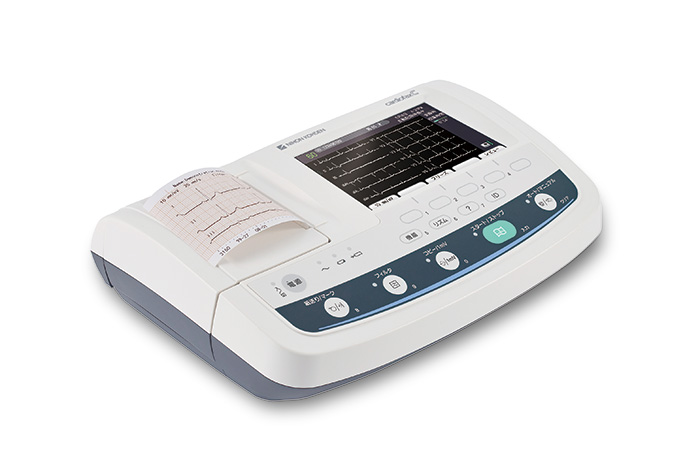 ポータブル心電図 持ち運び可能な心電図機器です。訪問診療時に使用し、虚血性心疾患、不整脈疾患等の検出に有用です。